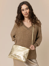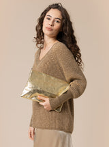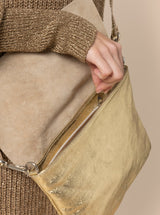 La pochette in pelle laminata disponibile in oro e argento è un accessorio elegante e versatile. La sua tracolla in pelle ne garantisce la comodità. Può essere portata a mano per un look più sofisticato o con la tracolla per un comfort maggiore. Perfetta per occasioni speciali, è un’ottima scelta per chi cerca uno stile raffinato e pratico allo stesso tempo.