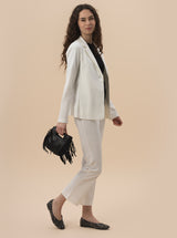 Pochette dalle piccole dimensioni, ma sorprendentemente capiente. Realizzata in pelle di alta qualità, presenta eleganti frange laterali in pelle scamosciata in tono, che aggiungono un tocco di movimento e stile. Può essere portata comodamente a mano o con la tracolla regolabile per una maggiore praticità. L’interno è foderato, mentre la chiusura a zip assicura la sicurezza dei tuoi oggetti. Un accessorio chic e funzionale, ideale per ogni occasione.