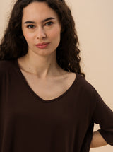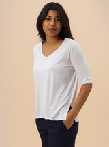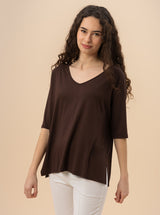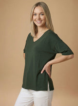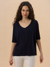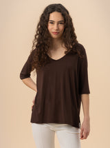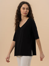 Scopri il nuovo capo Basic della collezione Spazio Quaranta: la T-shirt Dany. Realizzata in morbido jersey di viscosa, questa maglia offre una vestibilità ampia e confortevole, perfetta per ogni occasione. Il suo scollo a V aggiunge un tocco di eleganza discreta, mentre i due spacchetti laterali donano movimento e un tocco di originalità. Le maniche “magiche”, che arrivano appena sopra il gomito, completano il design con un effetto leggero e sofisticato. Una T-shirt versatile, ideale per un look casual ma ricercato.