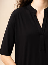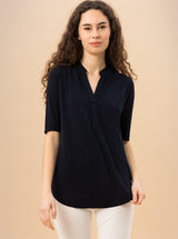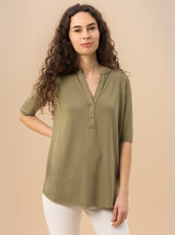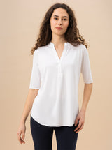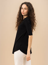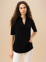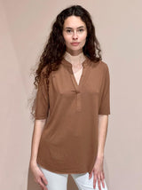La T-shirt Fabia è il perfetto mix di blusa, camicia e t-shirt, un capo versatile e di tendenza. Con il suo elegante collo alla coreana e la scollatura senza bottoni, offre un look pulito e sofisticato. La vestibilità fluida assicura comfort e libertà di movimento, mentre la stondatura sul fondo dona un tocco moderno e dinamico. Le maniche e il fondo della maglia presentano un taglio vivo, un dettaglio che aggiunge carattere e originalità al design minimalista. Ideale per chi cerca uno stile raffinato ma informale. Lunghezza manica "magica" che arriva sopra al gomito.