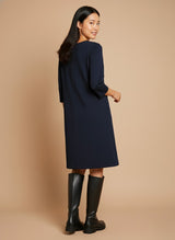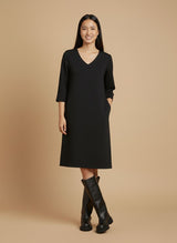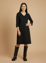 L'abito LUCIA realizzato in morbido jersey Punto Roma, (la maglia punto Roma è una maglia con la struttura e la mano di un tessuto, ma con la comodità del jersey). Caratterizzato da un raffinato scollo a V, presenta maniche a tre quarti impreziosite da un dettaglio con bordo alto e cucitura a vista che dona un tocco moderno e curato.