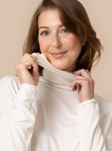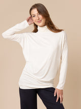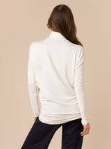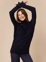 La GIORGIA con collo, che passione! Regina indiscussa del mondo Basic di Spazio Quaranta nasce anche con il collo alto. Ha una vestibilità morbida, non segna e puoi giocare sulla lunghezza. Il suo scollo alto non va girato ma deve scivolare sul collo creando piccole arricciature. Il tessuto in cui è realizzata è un jersey di viscosa, piacevolissimo al tatto e sulla pelle, tutto taglio vivo.